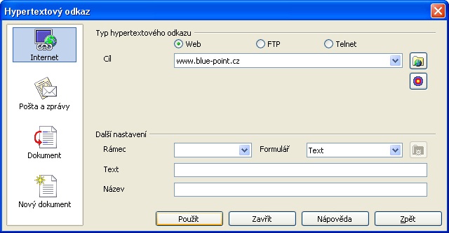 - (c) znovu klepněte na příkaz Vložit a zvolte Hypertextový odkaz , v poli Cíl vypište platnou URL adresu, kam se má dokument odkazovat a potvrďte Použít
