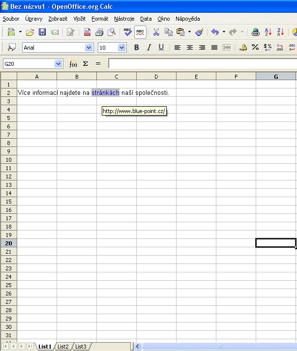 Hypertextový odkaz je vložen za původní text v buňce, což může být někdy trochu nepřehledné, neboť se zobrazuje celý výpis URL adresy. Z tohoto důvodu je možné použít raději druhý způsob vložení - odkaz aplikovaný na část textu v dokumentu.