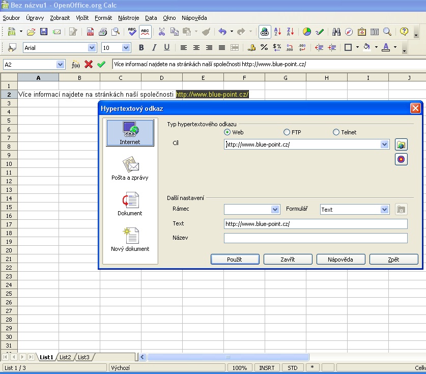 - (e) do pole Cíl napište platnou URL adresu stránky, kam chcete dokument CALCu odkazovat; protokol http:// doplní systém sám, není třeba jej vypisovat