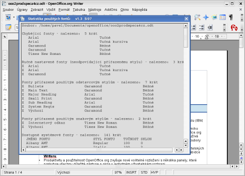 Toto šikovné rozšíření zjistí všechny fonty použité v dokumentu a ověří, zda jsou v systému nainstalovány. Též zobrazí i fonty přiřazené odstavcovým a znakovým stylům, jakož i všechny fonty, které máte v systému nainstalovány.