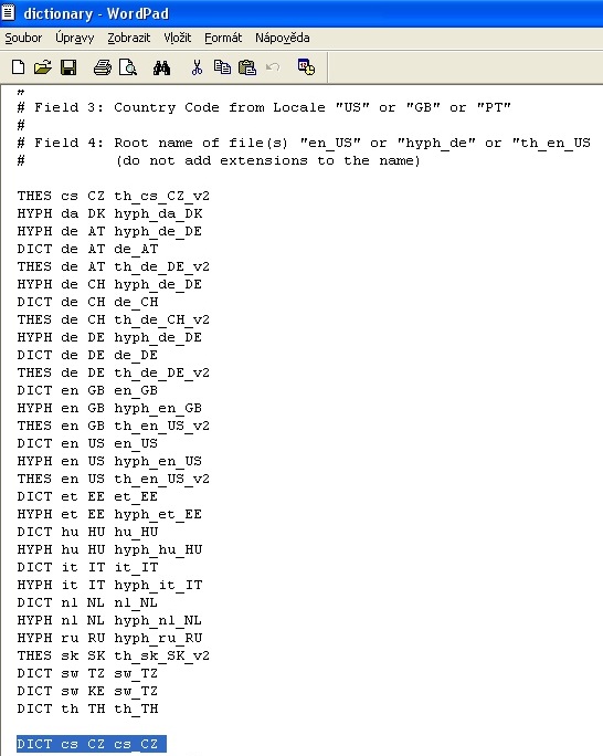 - na konec textu v tomto souboru vložte řádek DICT cs CZ cs_CZ